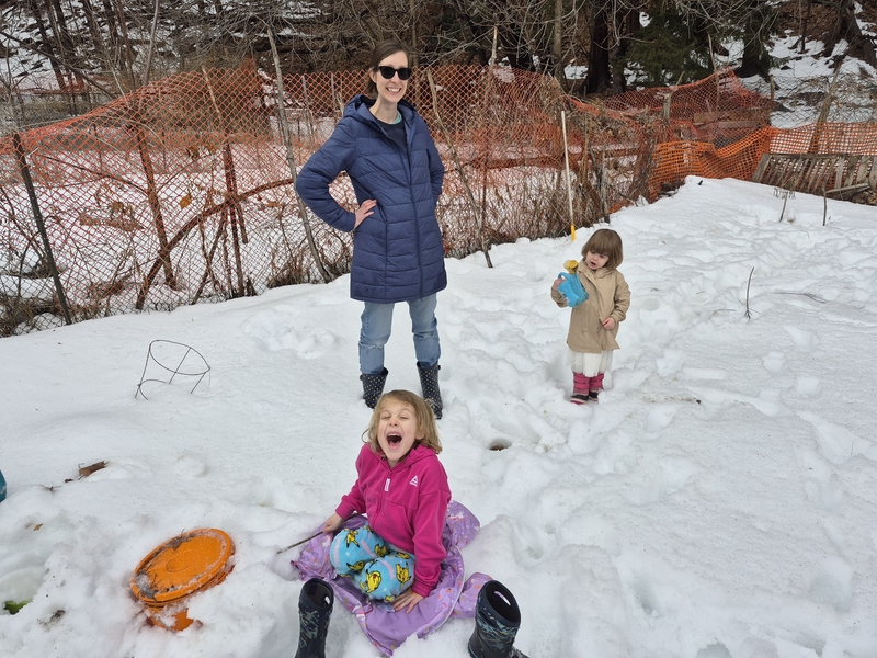 We were so stoked about gardening that we went and checked on our garden plot. Let’s just say that the weather is nowhere near ready for planting. Mira needed to squeeze through the door to get in and fetch us a shovel to dig the door out.
