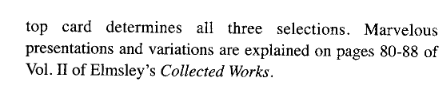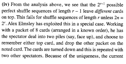 Diaconis, Persi, and Ron Graham. “The solutions to Elmsley’s Problem.” Math Horizons 14.3 (2007): 22-27.
